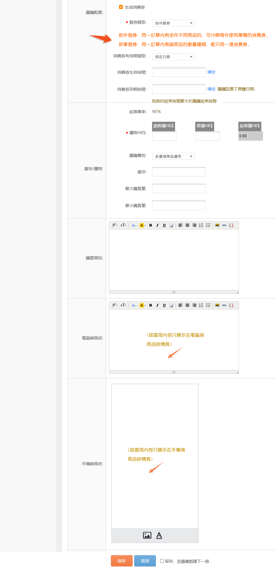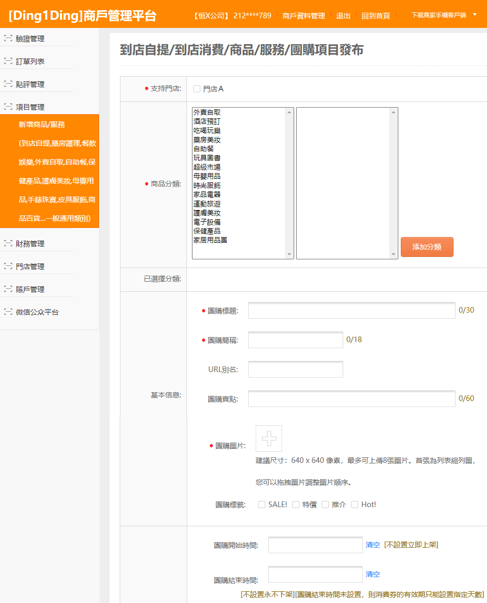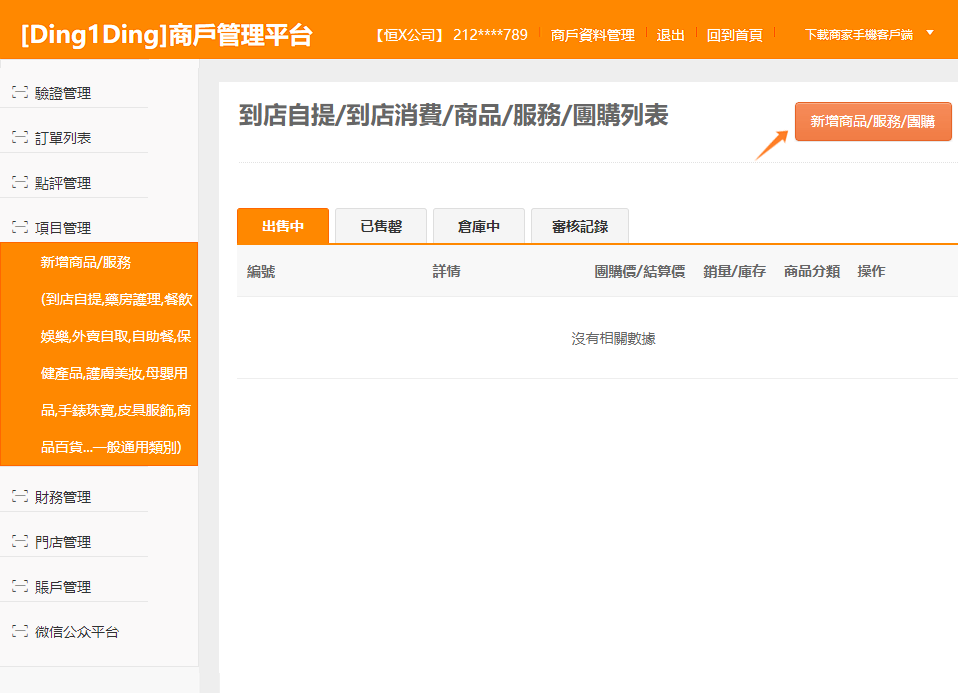 點擊左側菜單的“項目管理”->“(A)新增團購/商品/服務 (餐飲娛樂,到店自提,保健產品,手錶珠寶........)”->“新增團購/商品/服務”按紐,